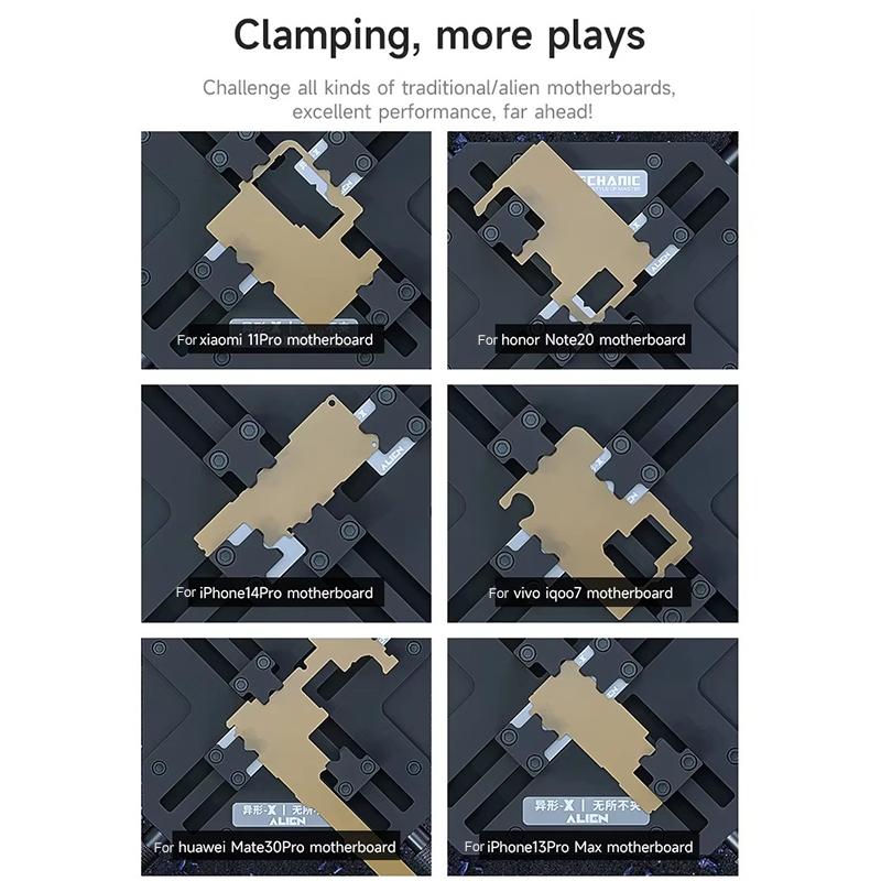 Mechanic Alien X V2.0 is a universal work holder for motherboards, with a patented design, created to meet the most complex challenges in electronic repairs. Thanks to its innovative structure, this device can secure both traditional motherboards and special and atypical models, providing a stable 360-degree grip without dead angles. The greatest advantage of the square universal clamp is its variable slot design, which allows flexible adjustment for boards and chips of different shapes and sizes. Additionally, the dedicated positioning area for A8-A17 chips ensures maximum stability and precision during repair and assembly processes, significantly increasing work efficiency. Made from premium materials, such as synthetic stone resistant to temperatures up to 500 degrees C and thickened steel plate, the holder guarantees durability and corrosion resistance. The anti-slip silicone components offer comfort in use, reducing hand fatigue, and additional stability through the anti-slip feet. This holder represents a professional and versatile solution, specially designed for technicians who need precision and safety in repair work.