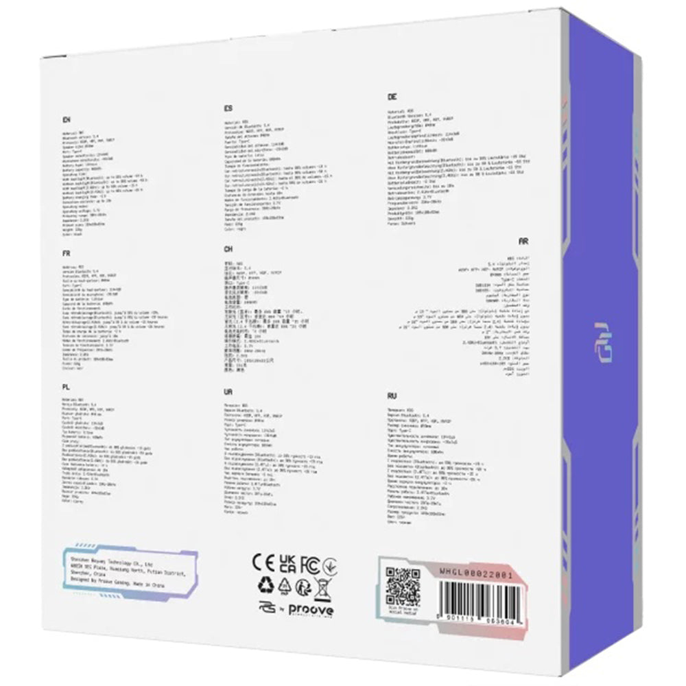 Constant audio performance, enhanced comfort, and a modern visual aspect for an uncompromised gaming experience. Order your Proove headphones! Clear Communication The integrated microphone with high sensitivity captures the voice clearly, without distortions, allowing precise communication in games. Extended Battery The high-capacity battery allows for long-term use of the headphones (without RGB lighting), without the need for frequent recharging. Specifications: Operating mode: 2.4GHz, Bluetooth; Charging port: Type-C; Bluetooth version: V5.4; Battery capacity: 900mAh; Battery type: lithium; Charging time: approx. 2 hours; Battery life with active lighting (volume up to 80%): approx. 14 hours; Battery life without lighting (volume up to 80%): 38-82 hours; Frequency: 20Hz - 20kHz; Impedance: 20 ± 2; Microphone sensitivity: -38 ± 3dB; Speaker sensitivity: 114 ± 3dB; Speaker size: Ø 40mm; Dimensions: 189 x 180 x 83; Weight: 226g; Bluetooth protocols: A2DP, HFP, AVRCP.