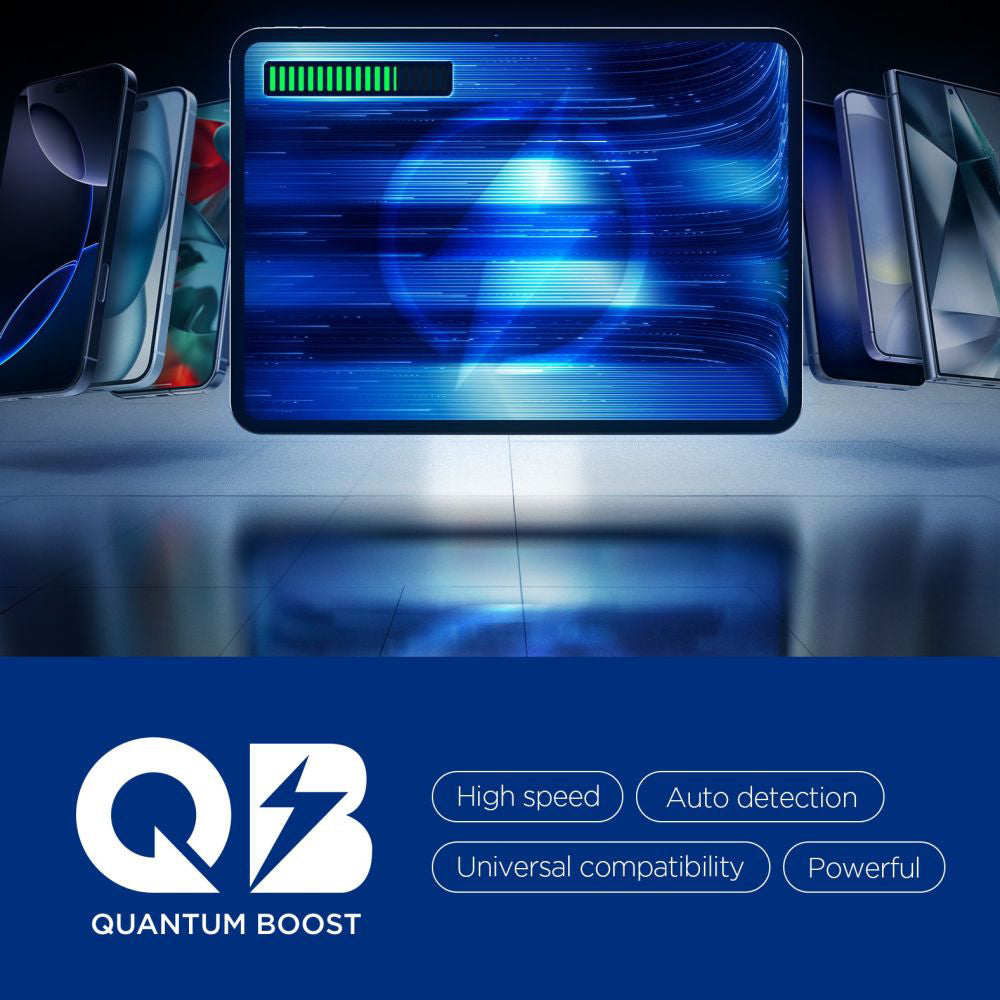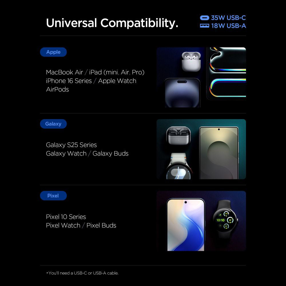 A well-built GaN network charger remains functional for years. That's why we recommend this high-performance charger with which you can age peacefully. Practical flexibility Spigen integrates 2 distinct ports so you can simultaneously power a modern Type-C device and a compatible USB accessory. Intelligent power management system With "Quantum Boost", this dual charger recognizes the connected device and automatically adjusts the charging parameters. Essential features for a GaN charger The polycarbonate casing ensures an excellent balance between light weight, mechanical durability, and efficient passive heat dissipation. Specifications: Material: PC (polycarbonate); Charging technology: GaN + Quantum Boost; Output ports: 1x USB-C, 1x USB; USB-C power: up to 35W; USB power: up to 18-19.5W; Maximum power: 35W; Power configurations (depending on how many ports are used): 2 devices simultaneously (USB-C + USB): total power 15W. Protocol compatibility: PD 3.0, PPS, QC 3.0, AFC, FCP, SCP; Dimensions: 31 x 32 x 41mm; Weight: ~ 60g; Compatibility: devices with USB-C (universal, iOS, and Android).
