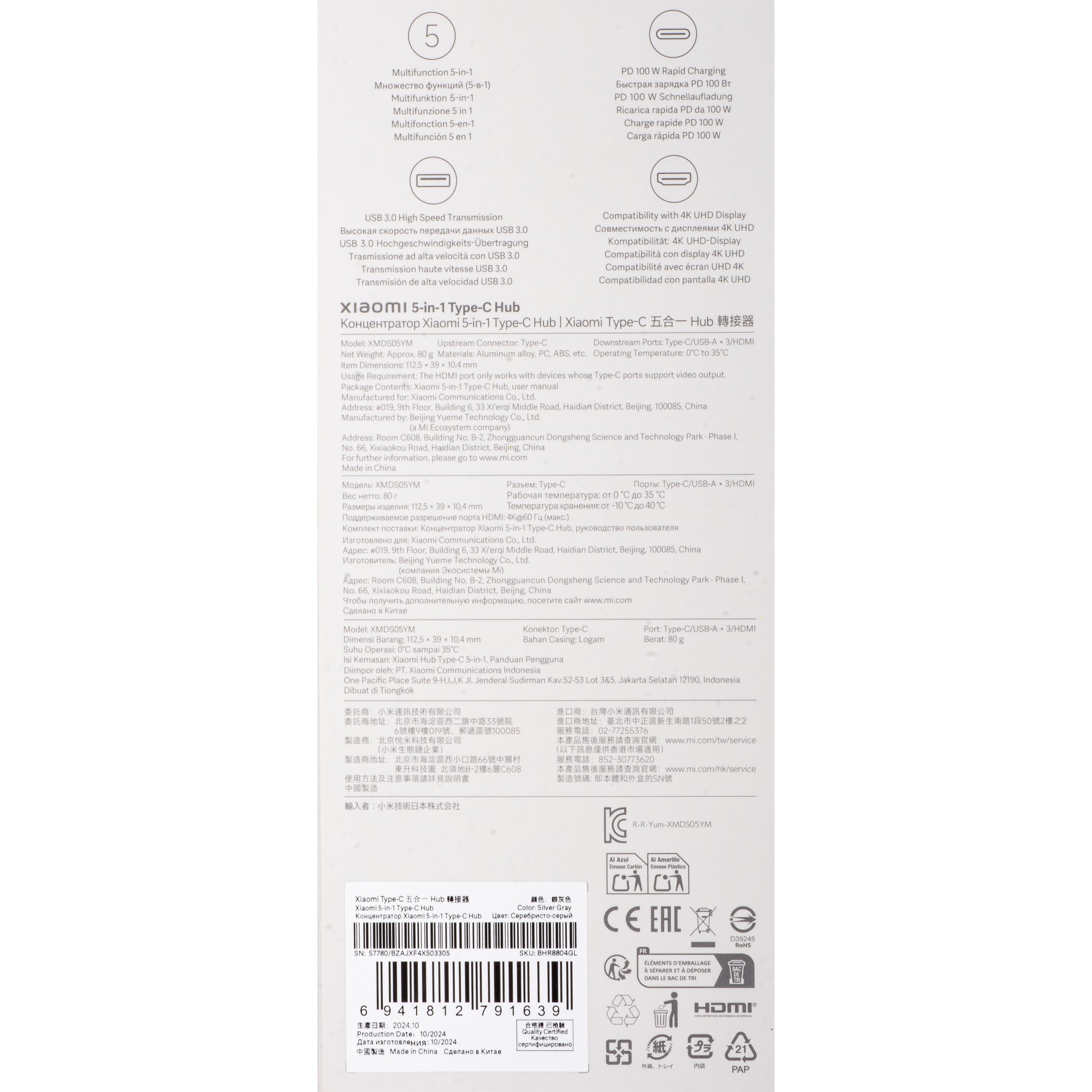 Xiaomi USB-C Hub, 3 x USB-A 3.0 - 1 x USB-C - 1 x HDMI, White BHR8804GL