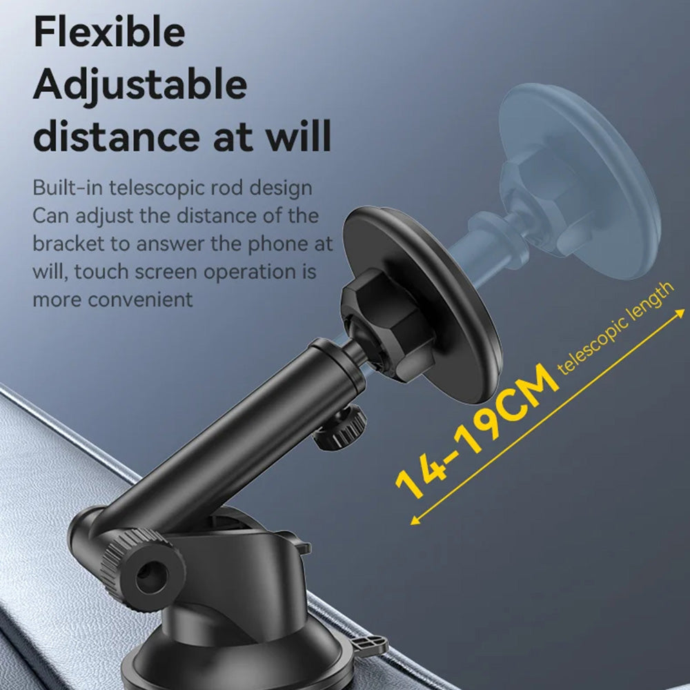 - Retractable arm with suction cup, ideal for dashboard or windshield