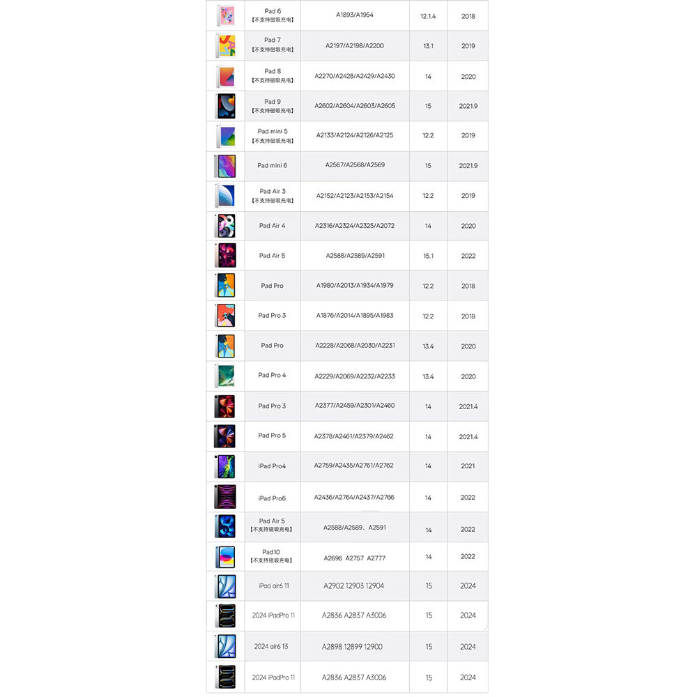 Kompatybilność: iPad 6 (2018), iPad 7 (2019), iPad 8 (2020), iPad 9 (2021), iPad Mini 5 (2019), iPad Mini 6 (2021), iPad Air 3 (2019), iPad Air 4 (2020), iPad Air 5 (2022), iPad Pro (2018), iPad Pro 3 (2018), iPad Pro (2020), iPad Pro 4 (2020), iPad Pro 3 (2021), iPad Pro 5 (2021), iPad Pro 4 (2020), iPad Pro 6 (2022), iPad Air 5 (2022), iPad 10 (2022), iPad Air 6 11" (2024), iPad Pro 11" (2024), iPad Air 6 13", iPad Pro 11".
